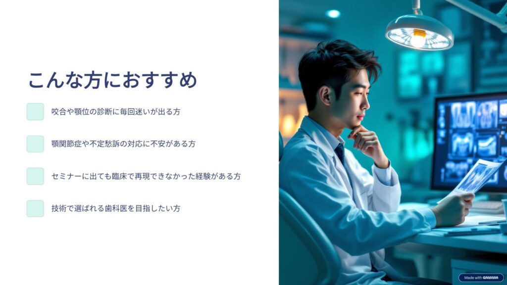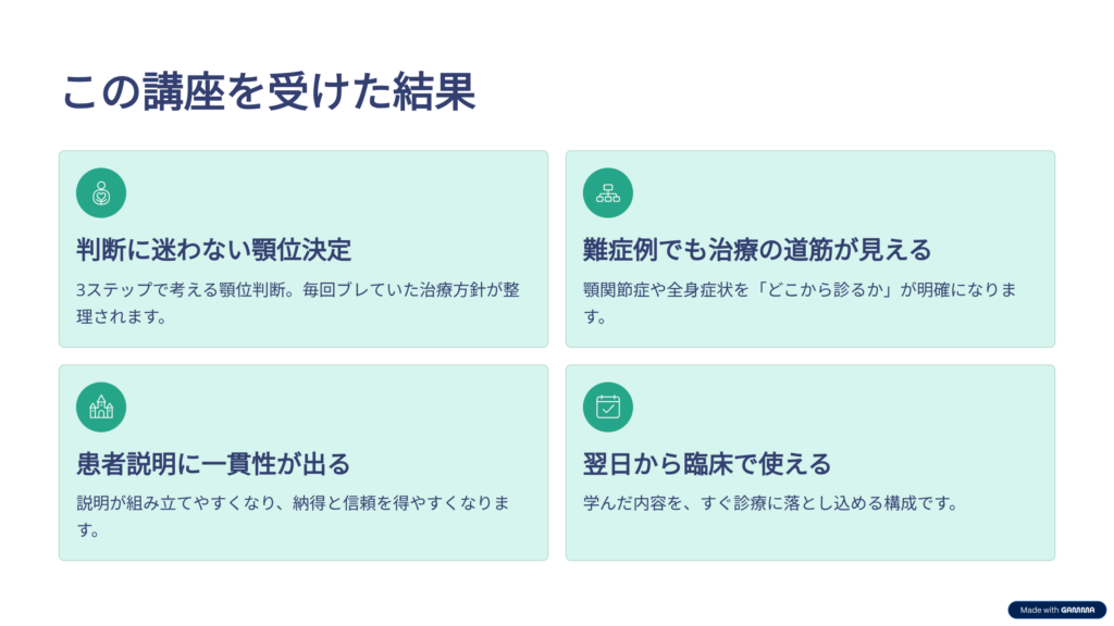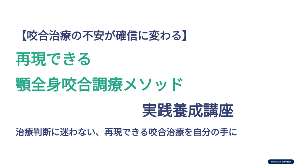 また様々な全身の不調が、本当に歯科と関連した症状であるのか、違うのかの『判定、診断法』や治療後の『予後判定方法』を学べます。