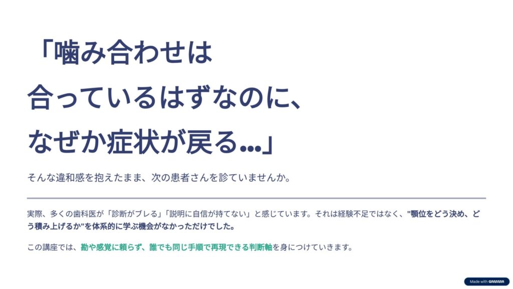 そんな歯科界の風潮中で、この新発想の咬合理論を学び有効活用すれば、日々の「顎関節症」や「噛み合わせ」での問題、悩みを解決し、「臨床力アップ」と「自費診療」「差別化」「専門性」への切り札となります。