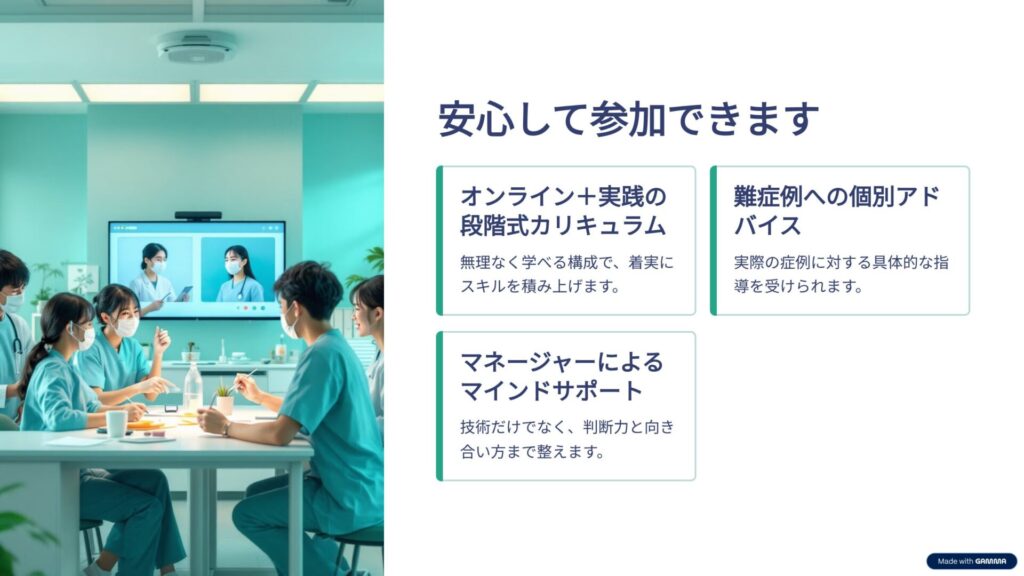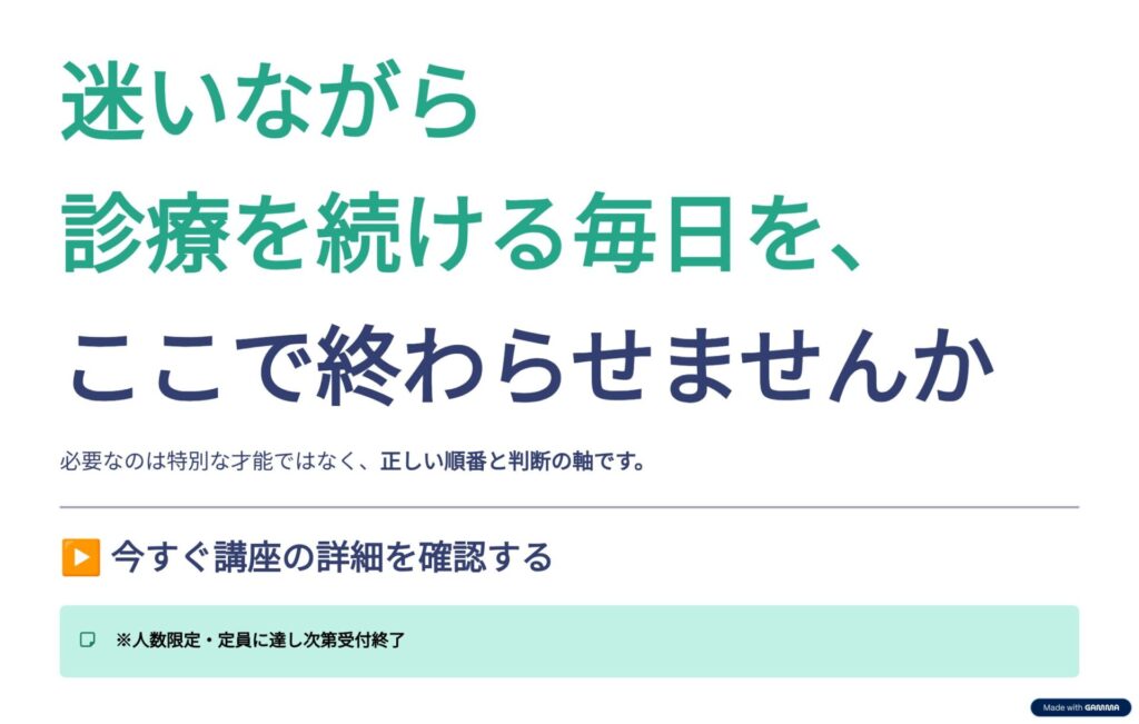 もしこれからセミナー等を受講することになれば、あなたは大学では決して学べないすぐに臨床にも応用できる新たな知見、技術を習得でき、さらなるバージョンアップにつながるものと考えています。