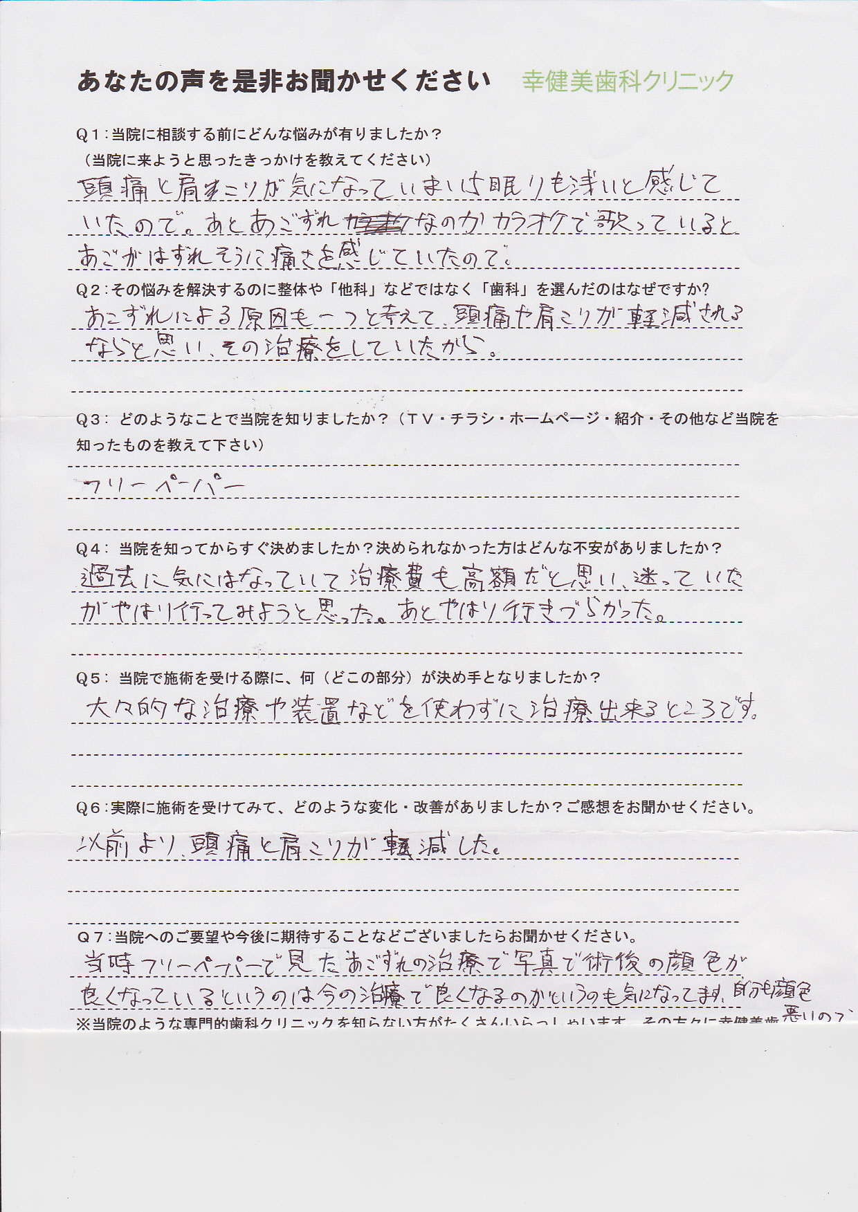 大々的な治療や装置を使わずに、治療できるところです。 2022 1/17 患者様の声 2014年7月11日2022年1月17日 患者様の声 よかったらシェアしてね! URLをコピーしました! URLをコピーしました! 右の頭と、顔のコリが、整体に通ってもよくならなかった。 朝起きた時に背中がつらくない。 関連記事 62.肩甲骨の痛みが取れて、自然と姿勢が良くなる。 2020年2月12日 61.過去にも顎関節症の治療を受けたことがあったので、今回はしっかり治そうと思いました。 2020年2月12日 60.毎日あった頭痛・肩こりが良くなった。偏頭痛の頻度が少なくなったように思う。 2020年2月12日 59.夜、食いしばりがなくなり、よく眠れるようになりました。顔の歪みがとれました。 2020年2月11日 58.噛み合わせが、身体全体のバランスに関係あることを知り、それを実際に体験して納得できました。 2020年2月11日 57.首の調子が悪いのは、あごと関係があるのだろうと、ネットで調べたりしてなんとなくわかっていました。 2020年2月11日 56.毎日耐えられなかった痛みが嘘のようです。背骨が曲がっていて、臼蓋形成不全による左膝関節痛、ぎっくり腰がありました。 2020年2月11日 55.頭痛、首や肩の痛み、口の開けにくさなどがほとんどなくなりました。 2020年2月11日